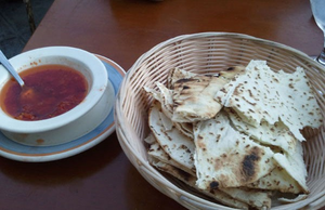 Setelah bingung memilih makanan, melihat menu dan di-sort by harga, kita memilih Lamb Pizza. Setelah menunggu cukup lama akhirnya dan beberapa kali refill air putih, akhirnya makananannya datang juga. Ada yang aneh, kita pesan pizza kok yang muncul roti ya?
