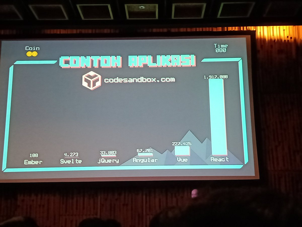 Satu-satunya yang bisa mendapatkan total jumlah aplikasi per framework atau pustaka adalah dari codesandbox. Dan disini sangat jauh perbedaan antar framework. React mendominasi dengan nyaris ada 2 juta contoh aplikasi. Sangat jau dibandingkan vue yang hanya dua ratus ribuan.